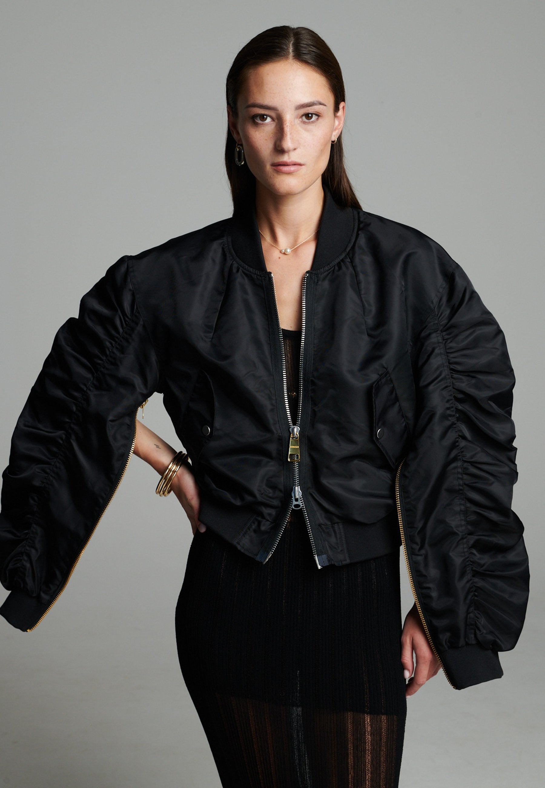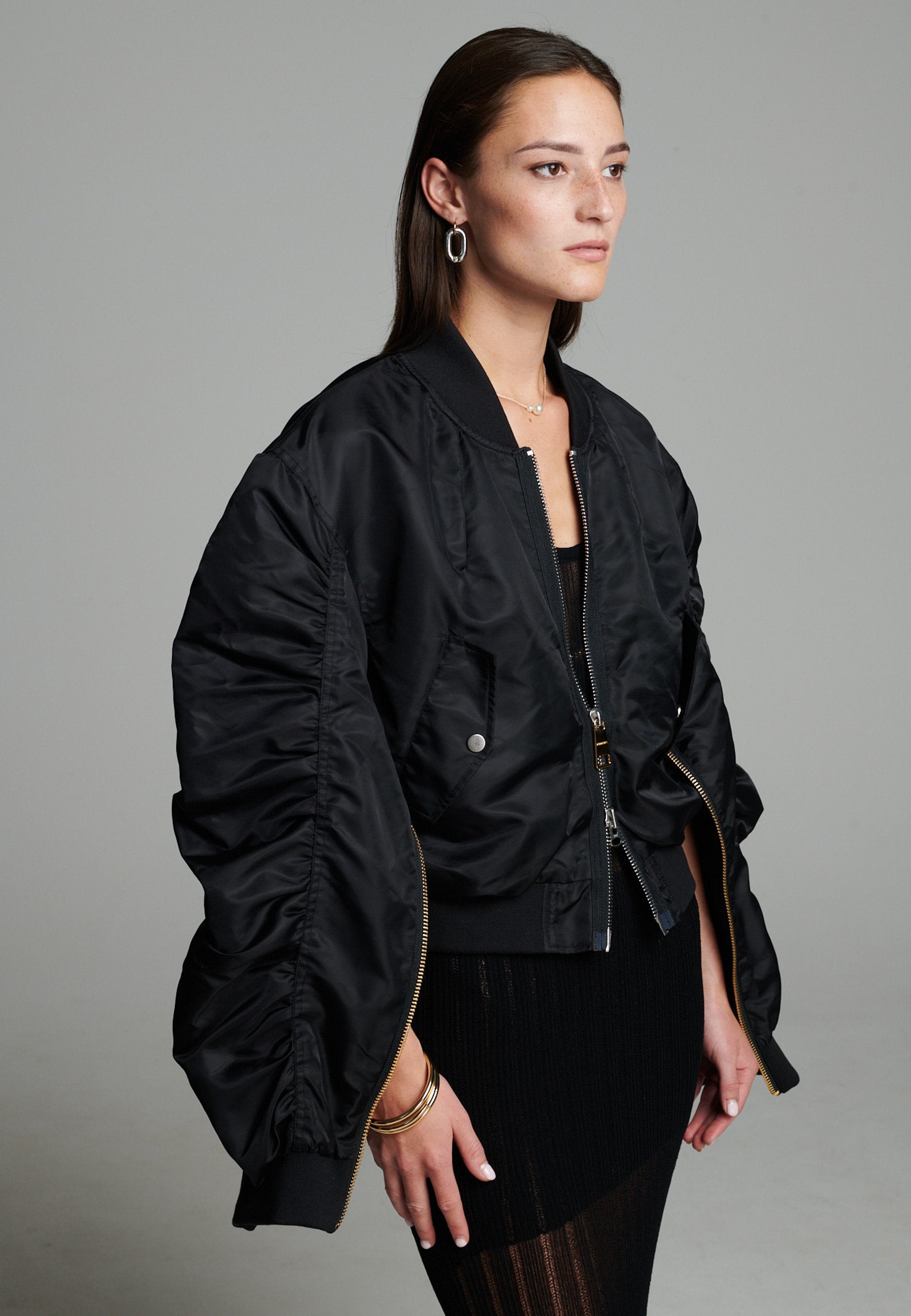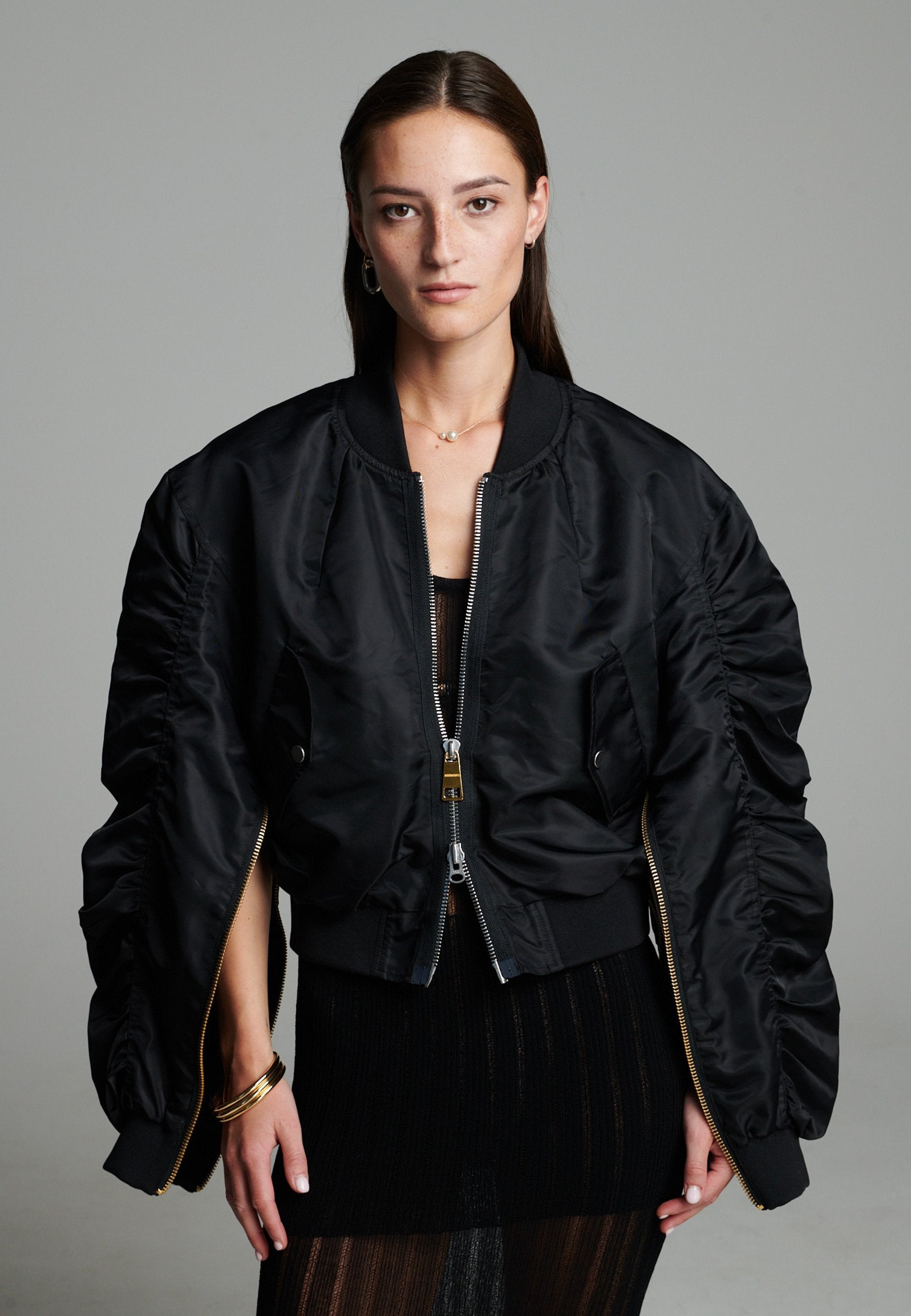 Uma peça de destaque com uma silhueta exagerada, moldada por mangas franzidas e um corpo estruturado e curto. Zíperes arrojados emolduram a frente e as laterais, adicionando ousadia e versatilidade, enquanto acabamentos em malha canelada suavizam o visual. Uma abordagem moderna a um clássico casaco bomber, projetado para dar atitude a qualquer look.
