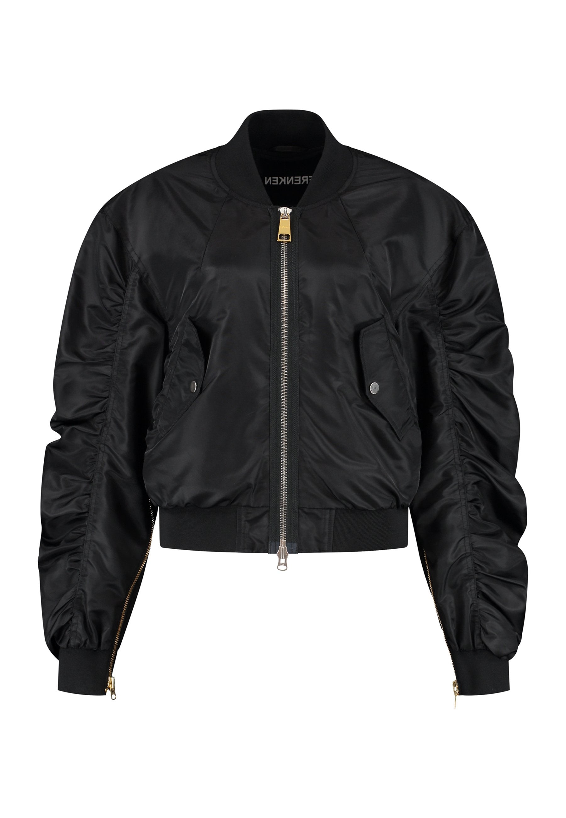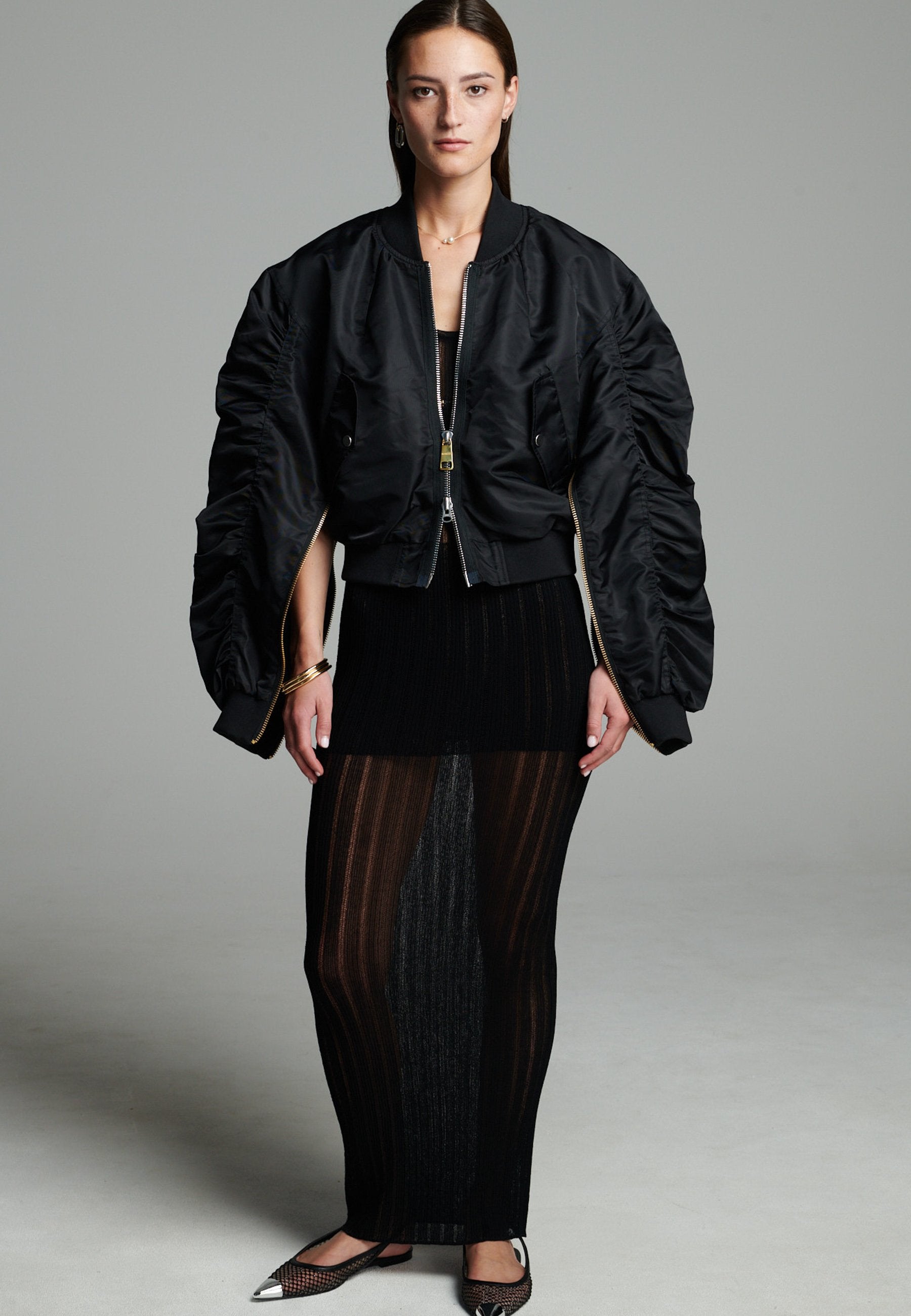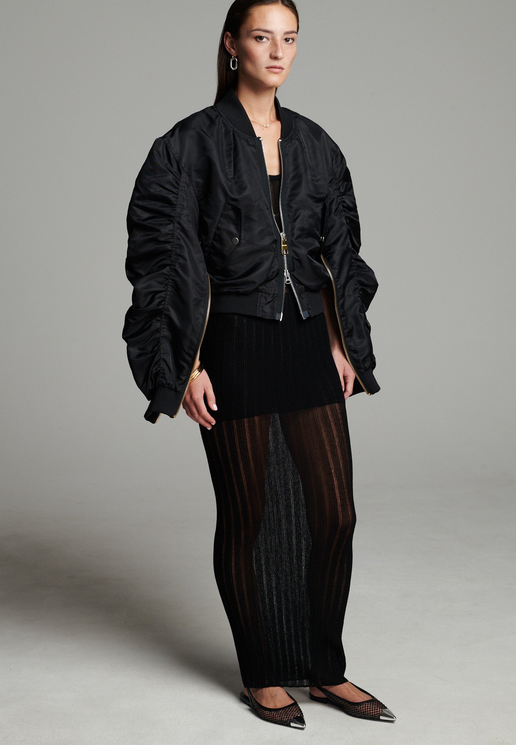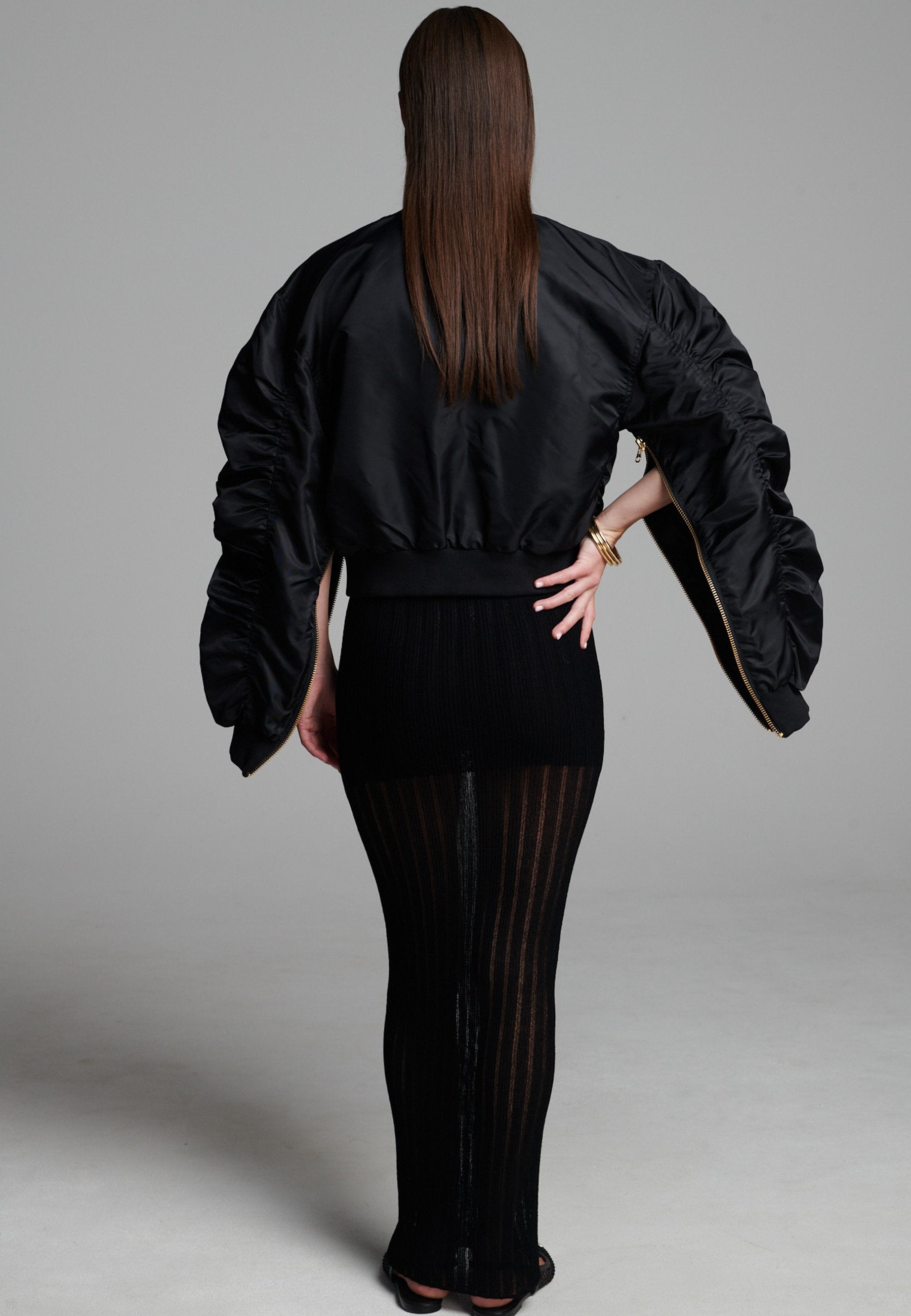 Uma peça de destaque com uma silhueta exagerada, moldada por mangas franzidas e um corpo estruturado e curto. Zíperes arrojados emolduram a frente e as laterais, adicionando ousadia e versatilidade, enquanto acabamentos em malha canelada suavizam o visual. Uma abordagem moderna a um clássico casaco bomber, projetado para dar atitude a qualquer look.