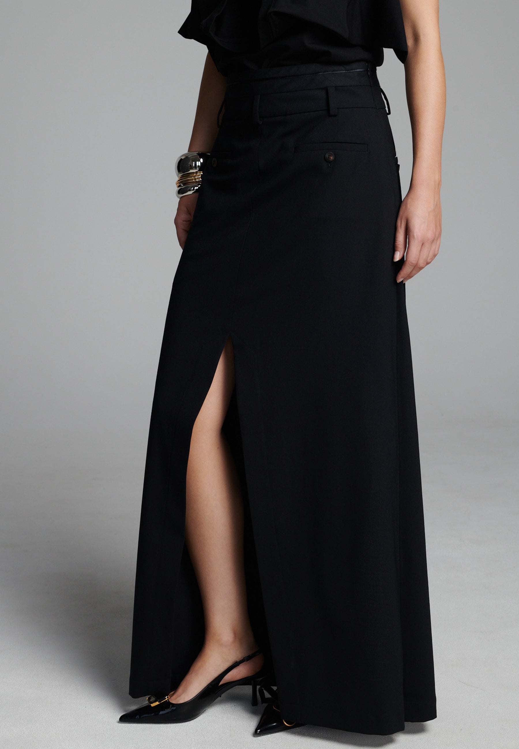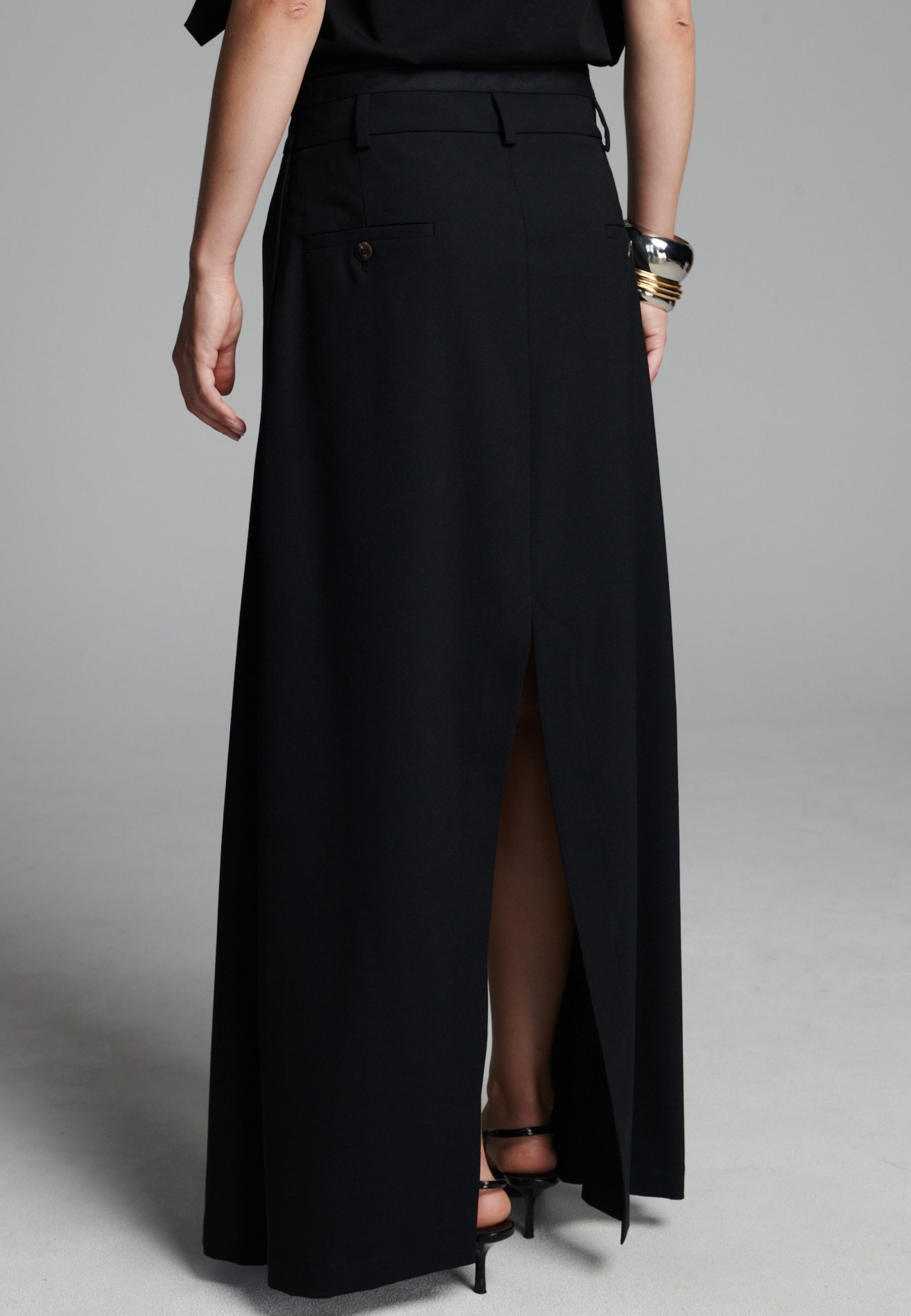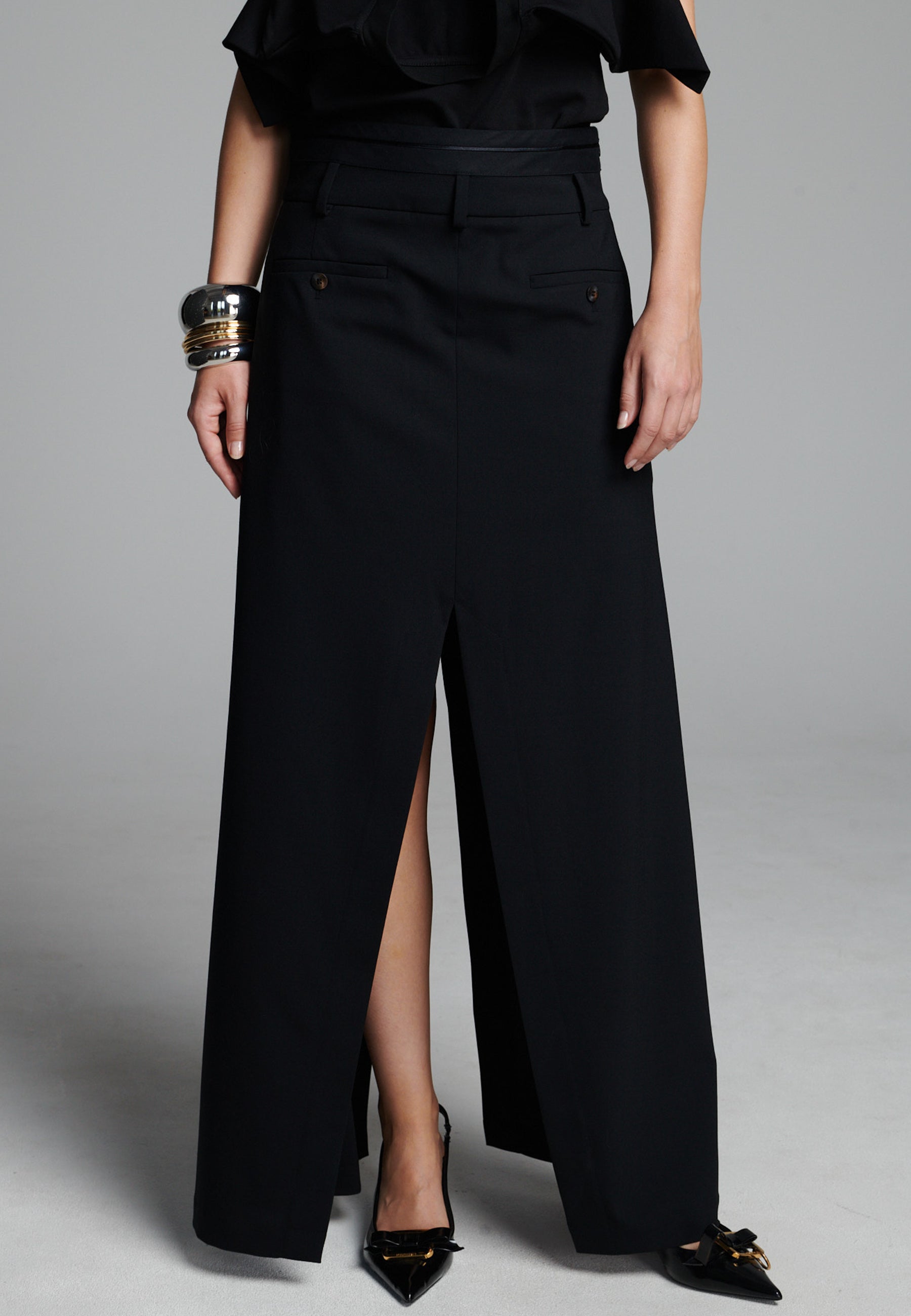 Uma silhueta híbrida elegante confere um toque moderno a esta peça de alfaiataria. Feita em tecido de fato preto estruturado, combina a parte frontal impecável de uma saia com a facilidade e o movimento de calças de pernas largas. Uma fenda frontal acentuada revela vislumbres da perna a cada passo, enquanto os bolsos embutidos e as presilhas de cinto mantêm o design enraizado na alfaiataria clássica. Fácil de combinar, adiciona um toque arquitetónico tanto a looks minimalistas como a looks mais ousados.