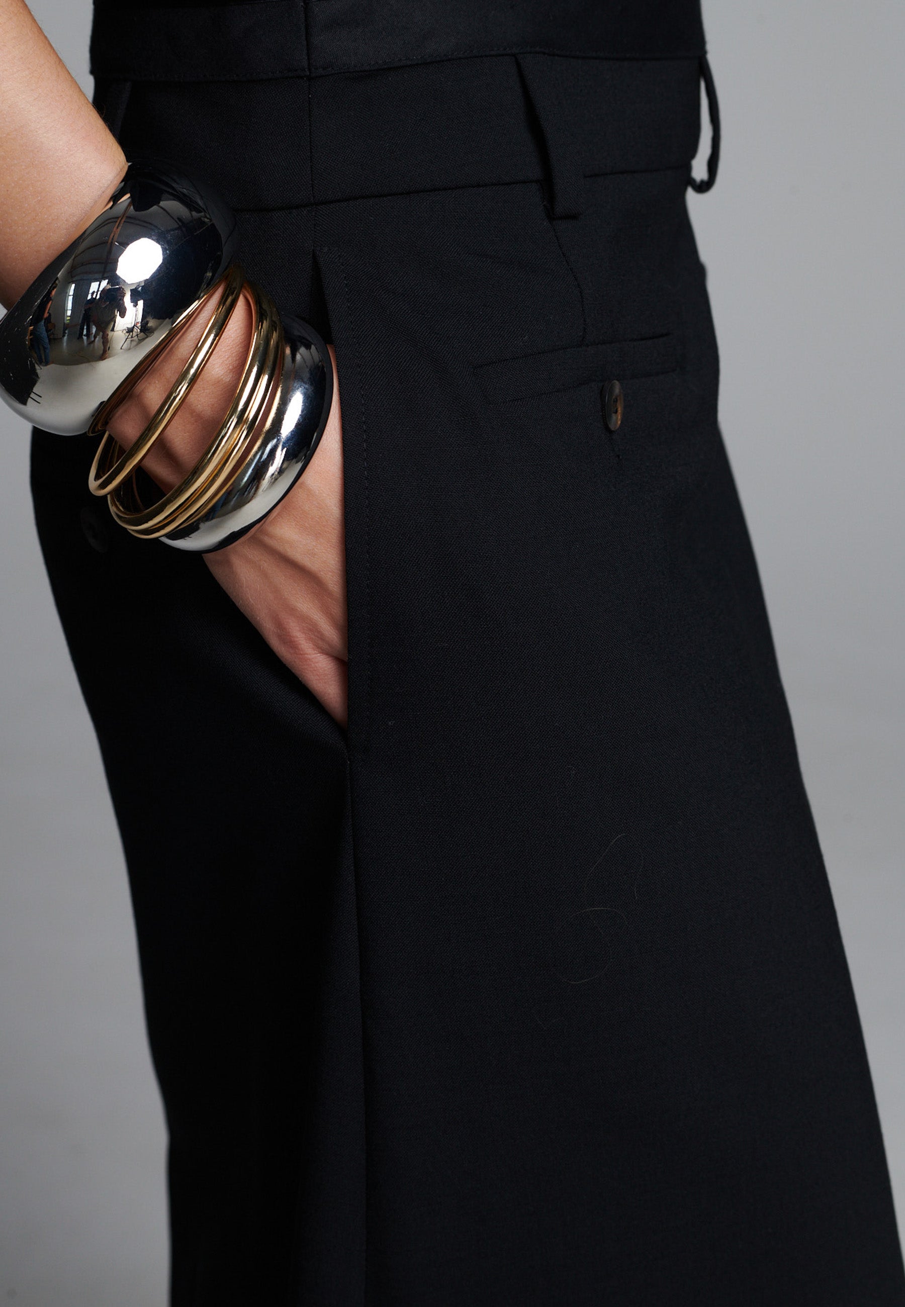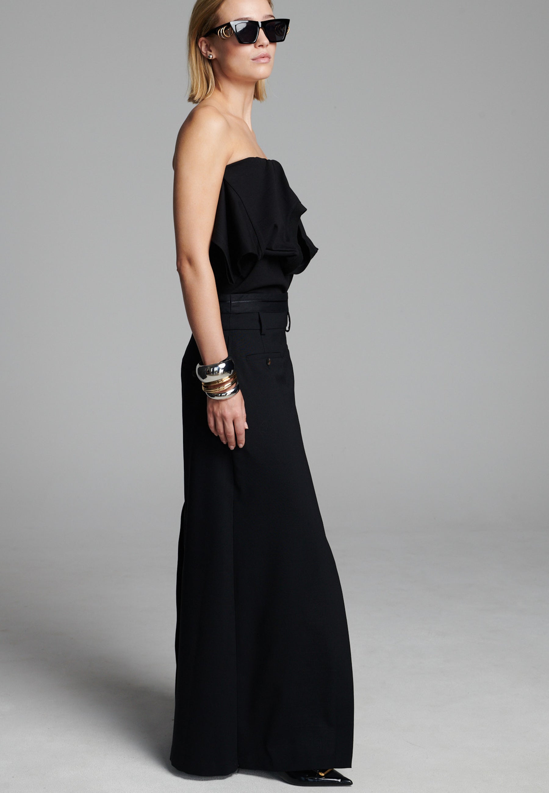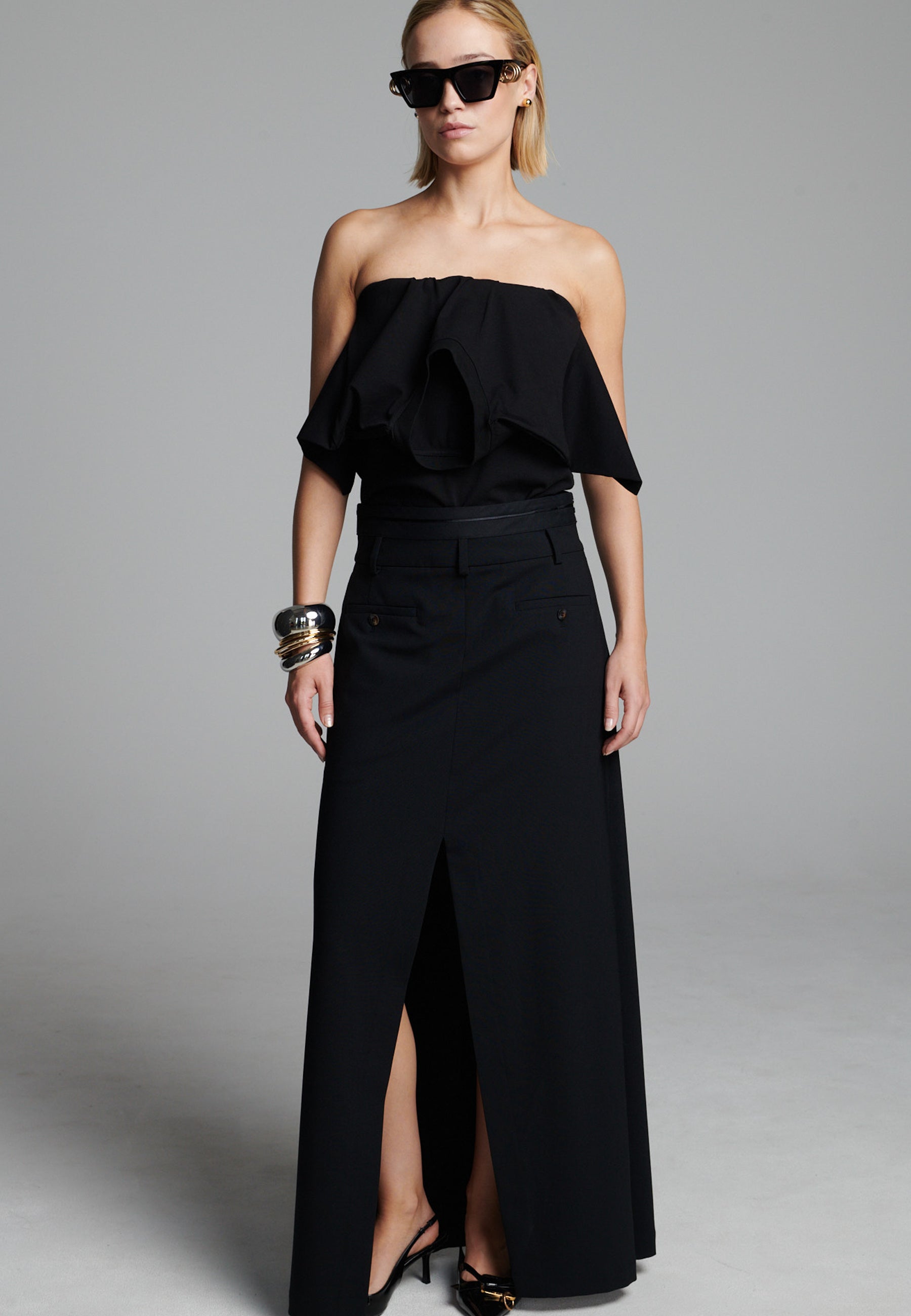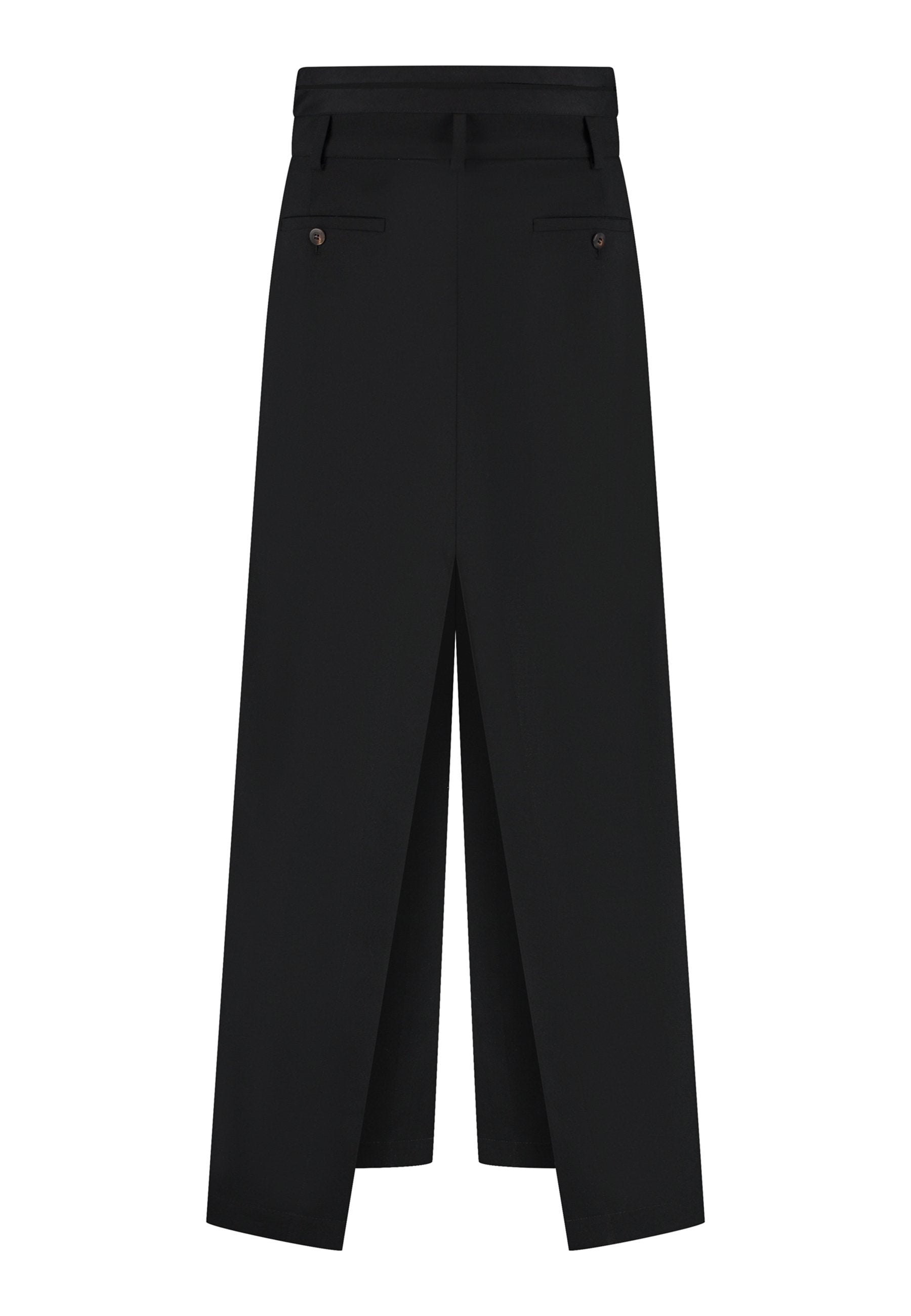 Uma silhueta híbrida elegante confere um toque moderno a esta peça de alfaiataria. Feita em tecido de fato preto estruturado, combina a parte frontal impecável de uma saia com a facilidade e o movimento de calças de pernas largas. Uma fenda frontal acentuada revela vislumbres da perna a cada passo, enquanto os bolsos embutidos e as presilhas de cinto mantêm o design enraizado na alfaiataria clássica. Fácil de combinar, adiciona um toque arquitetónico tanto a looks minimalistas como a looks mais ousados.