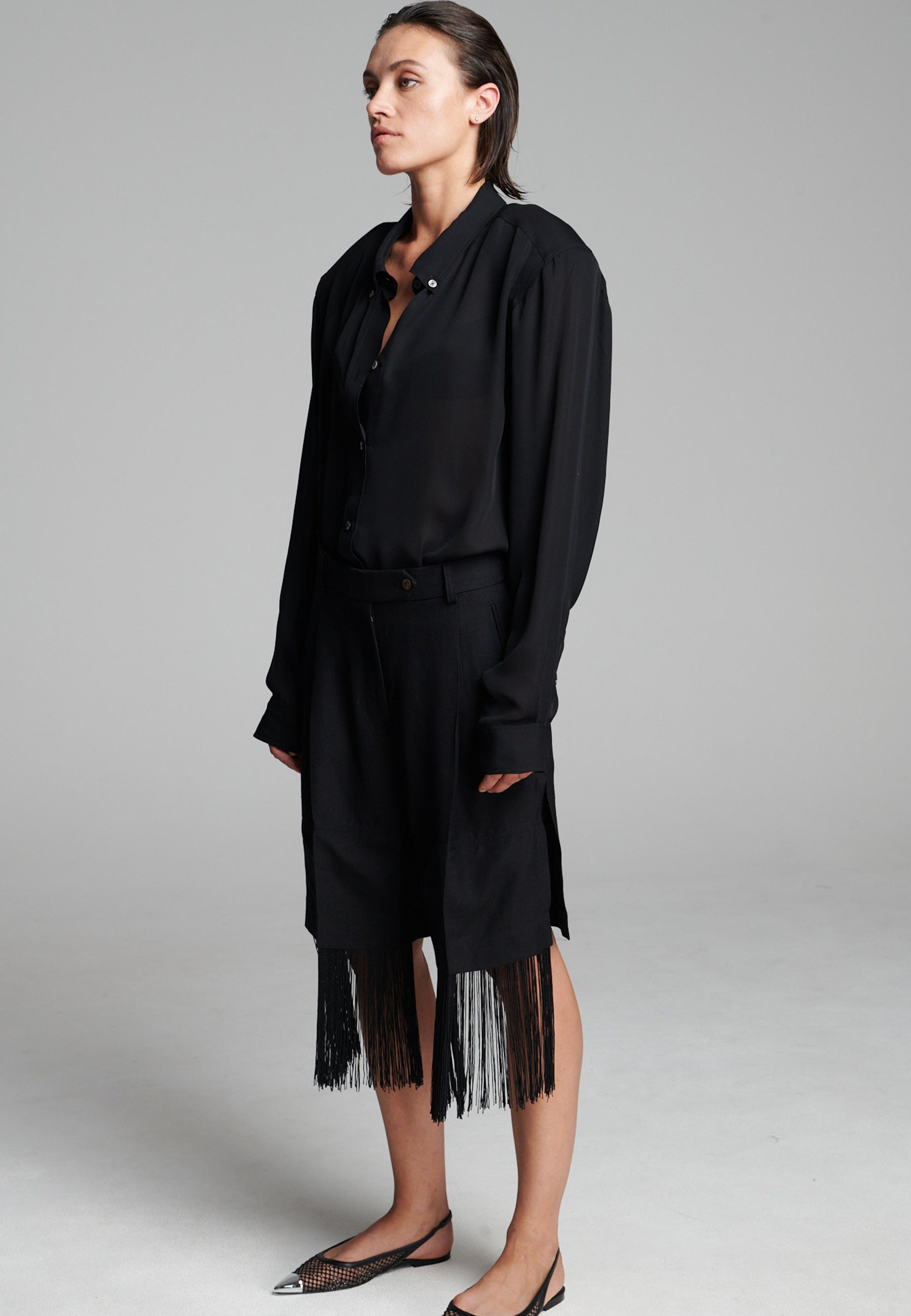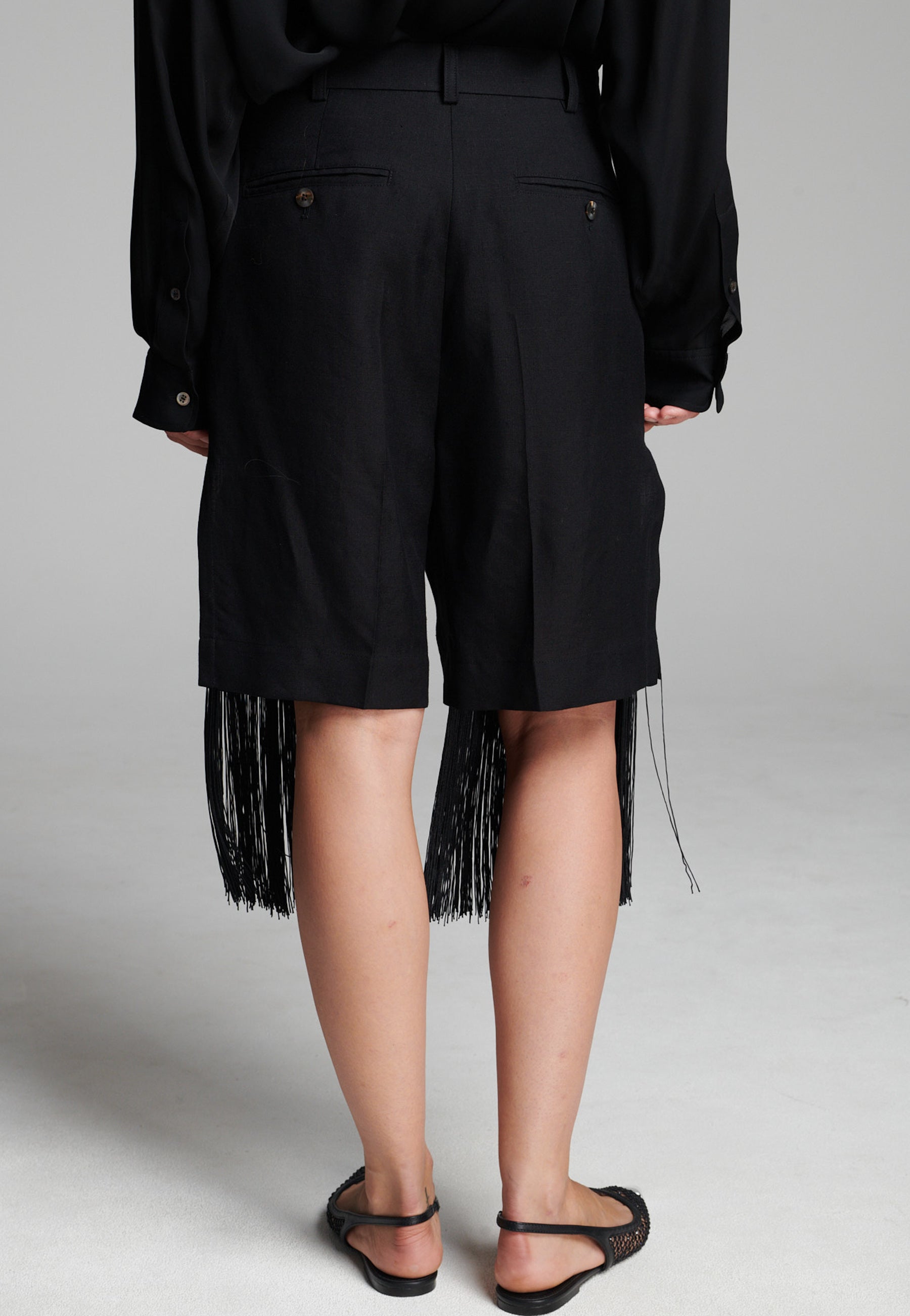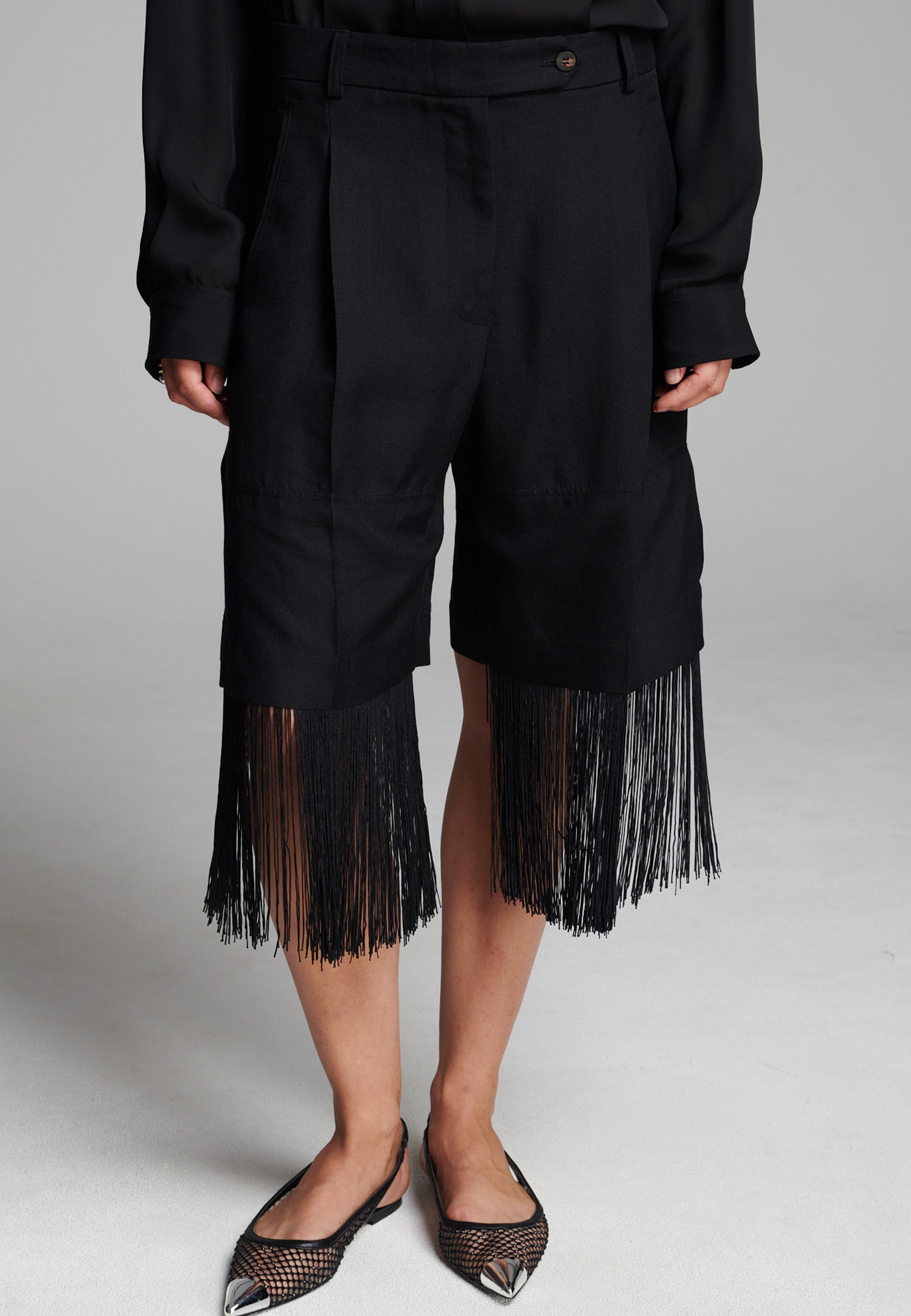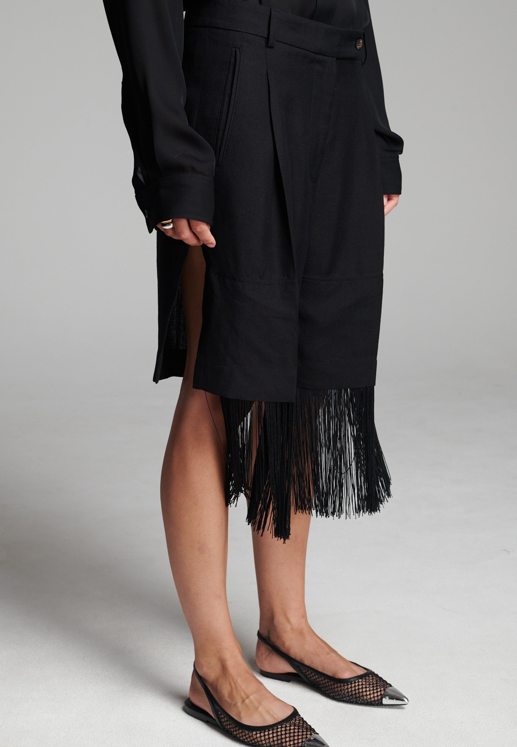 Estes calções combinam um corte elegante com um movimento marcante. Feitos de tecido preto estruturado, caem até à altura do joelho antes de se soltarem em painéis de franjas longos e fluidos que balançam a cada passo. As fendas laterais abrem a silhueta e revelam as franjas por baixo, adicionando profundidade e um acabamento dinâmico. O ajuste mantém-se refinado na cintura e nas ancas, criando uma peça sofisticada, mas divertida, que eleva os visuais de tempo quente com um toque arrojado de textura.