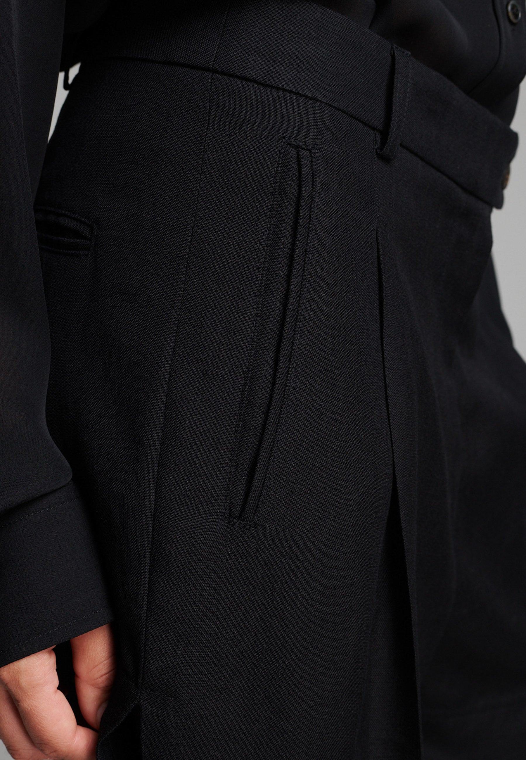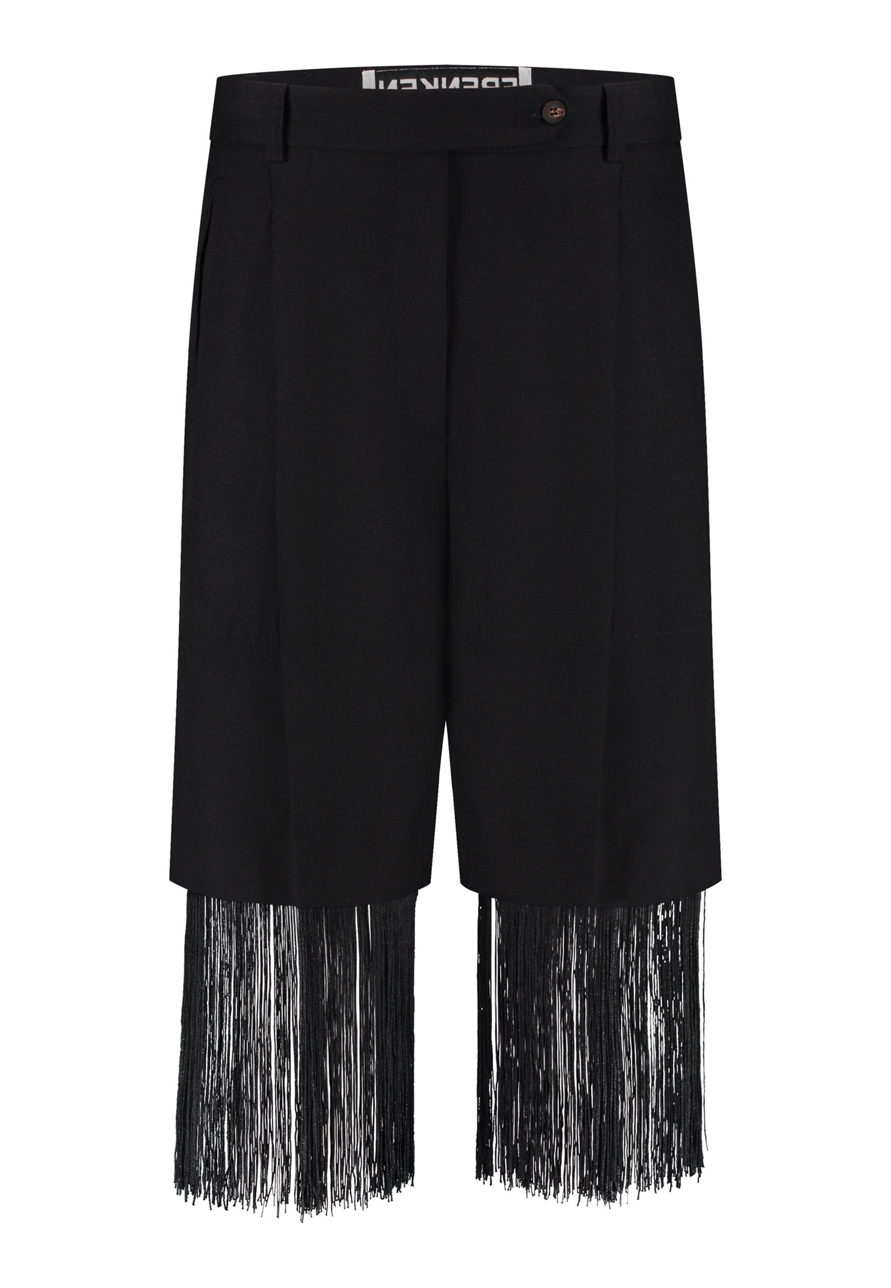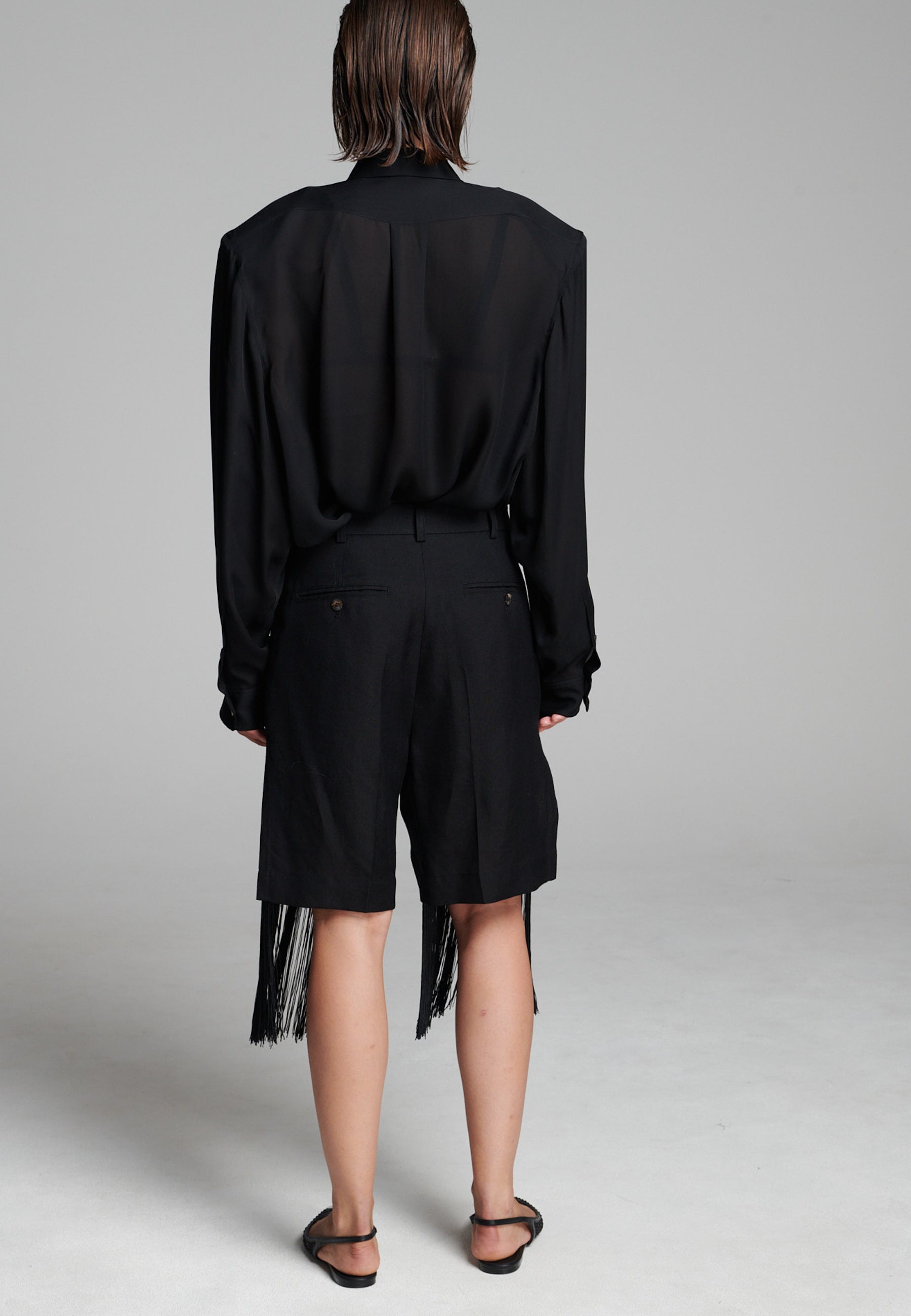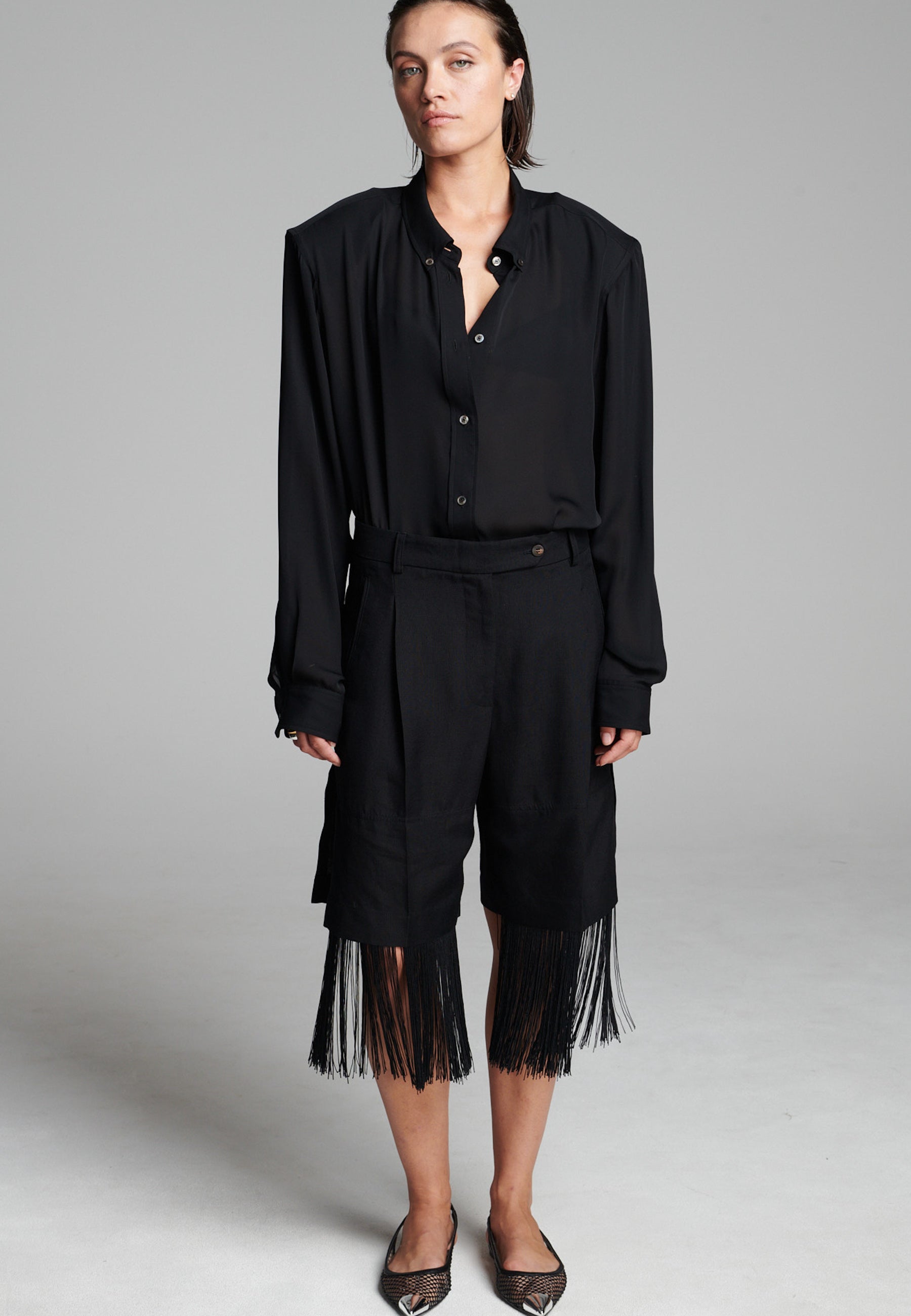 Estes calções combinam um corte elegante com um movimento marcante. Feitos de tecido preto estruturado, caem até à altura do joelho antes de se soltarem em painéis de franjas longos e fluidos que balançam a cada passo. As fendas laterais abrem a silhueta e revelam as franjas por baixo, adicionando profundidade e um acabamento dinâmico. O ajuste mantém-se refinado na cintura e nas ancas, criando uma peça sofisticada, mas divertida, que eleva os visuais de tempo quente com um toque arrojado de textura.